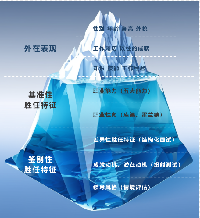 胜任特征(Competency)指能将某一工作(或组织、文化)中有卓越成就者与表现平平者区分开来的个人的潜在特征。这些特征可能包括动机、特质、自我形象、态度或价值观、特定领域的知识、认知或行为技能等。它们可以通过可靠的方法进行测量或计数,并且能够显著地区分优秀与一般的绩效。胜任特征不仅包括了易于观察的外显胜任力,如知识和技能,也包括较难察觉但对其工作绩效产生重要影响的深层次的自我概念、特质和动机。